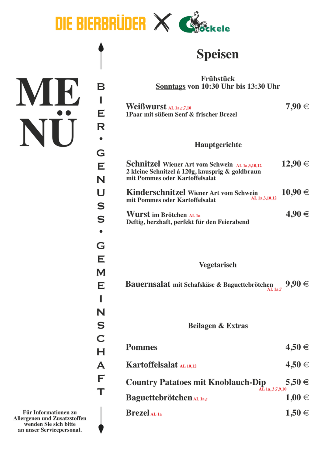 Es warten 5 frisch gezapfte Biere auf Sie, dazu eine kleine Speisekarte für den großen und kleinen Hunger!